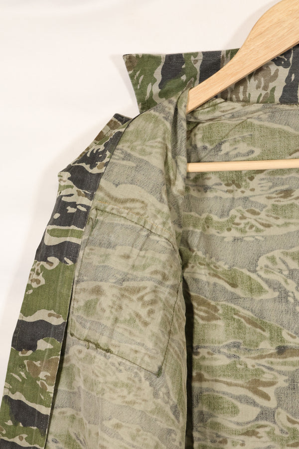 CIDGパターンはラフなプリントで生地も比較的堅めなのが特徴です。他の日本製のタイガーストライプに比べて異なる点が多いためおそらくベトナム製もしくは周辺諸国、例えばタイや台湾などの可能性も考えられます。ベトナム現地兵などが使用した例も多く、小さいサイズが多い中で比較的大きめサイズです。退色すると全体的に白くなります。比較的珍しいパターンです。中古品ですので返品はできません。ご了承くださいませ。