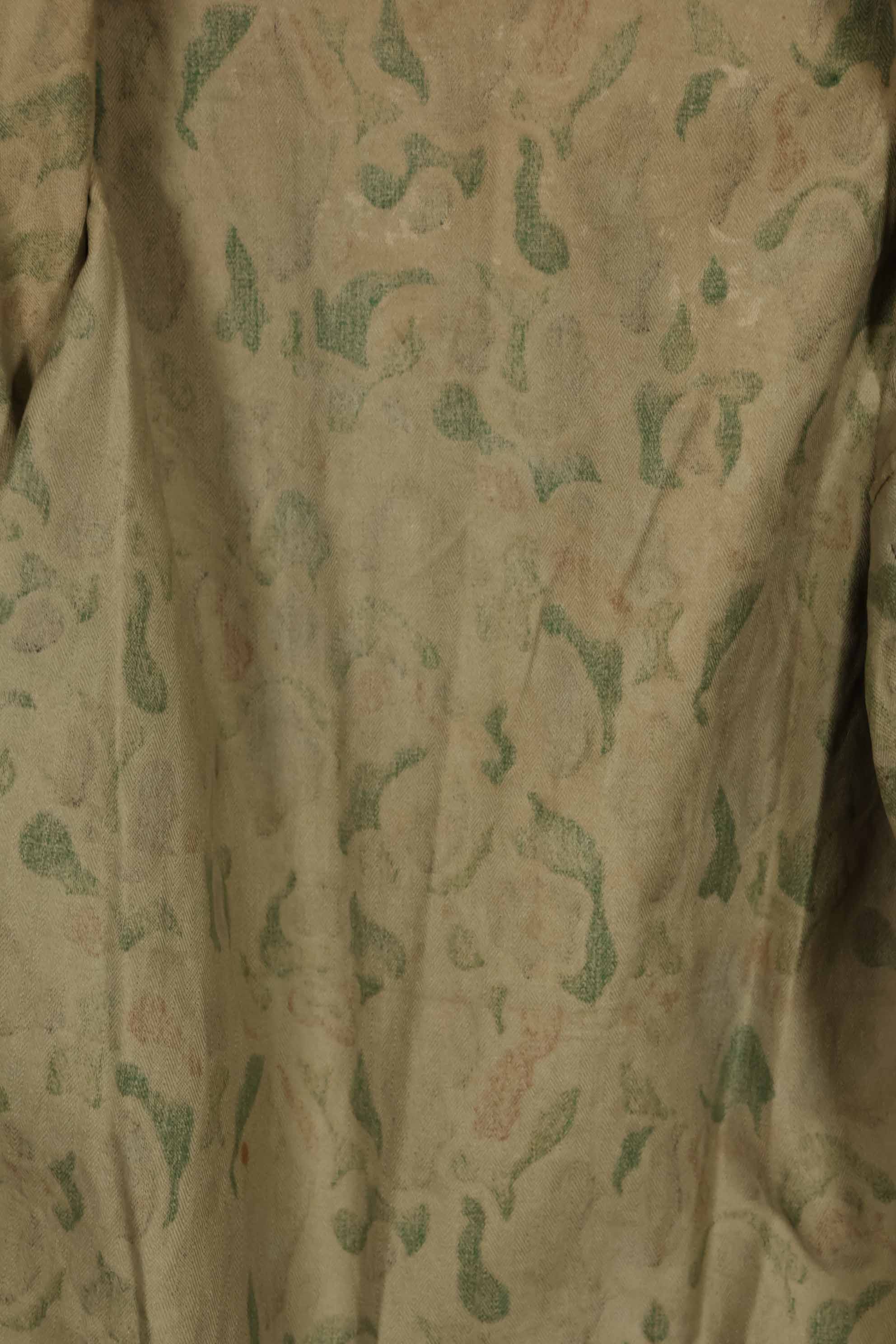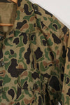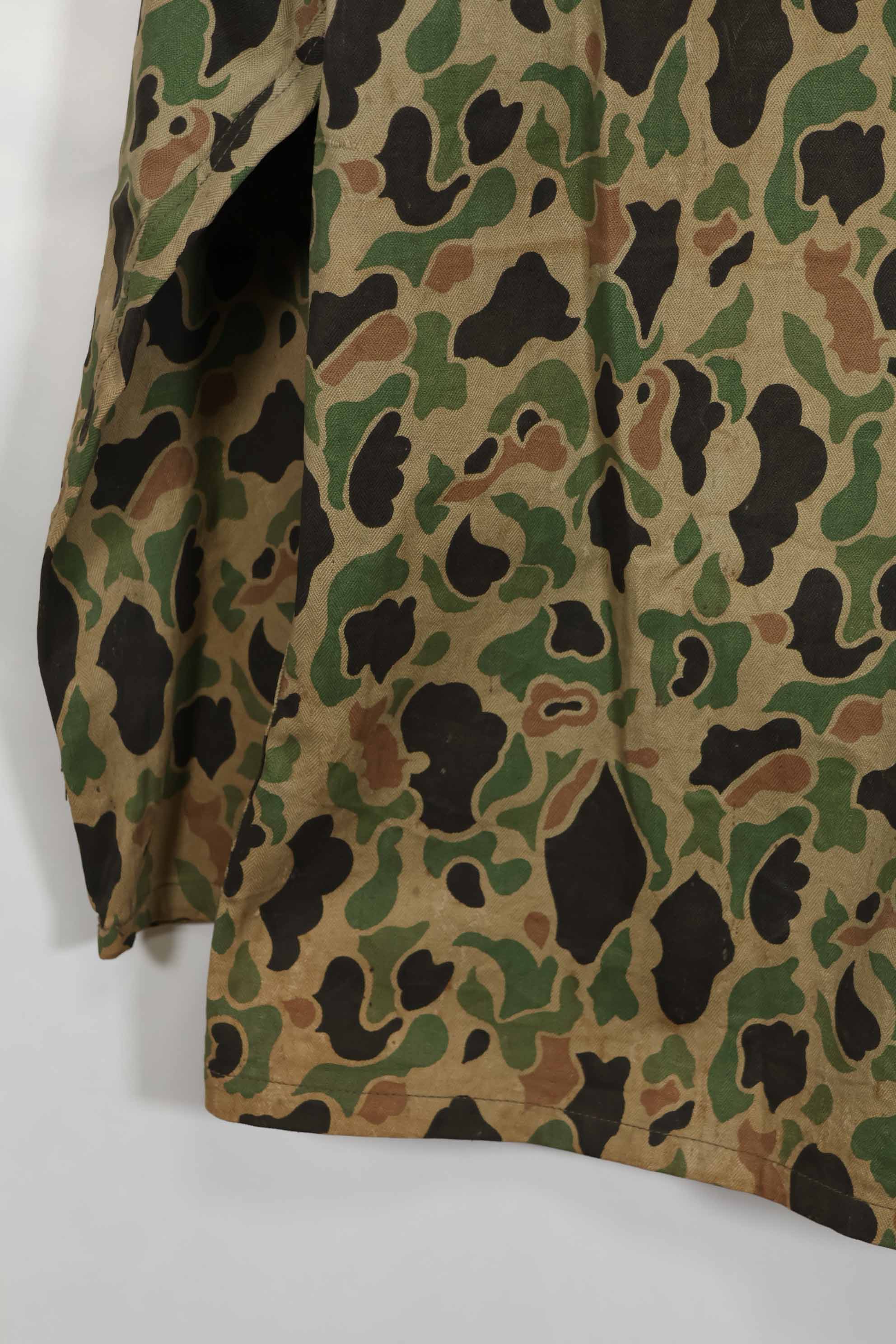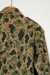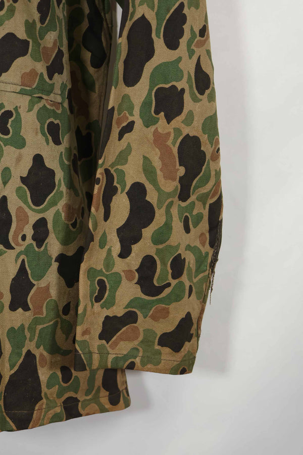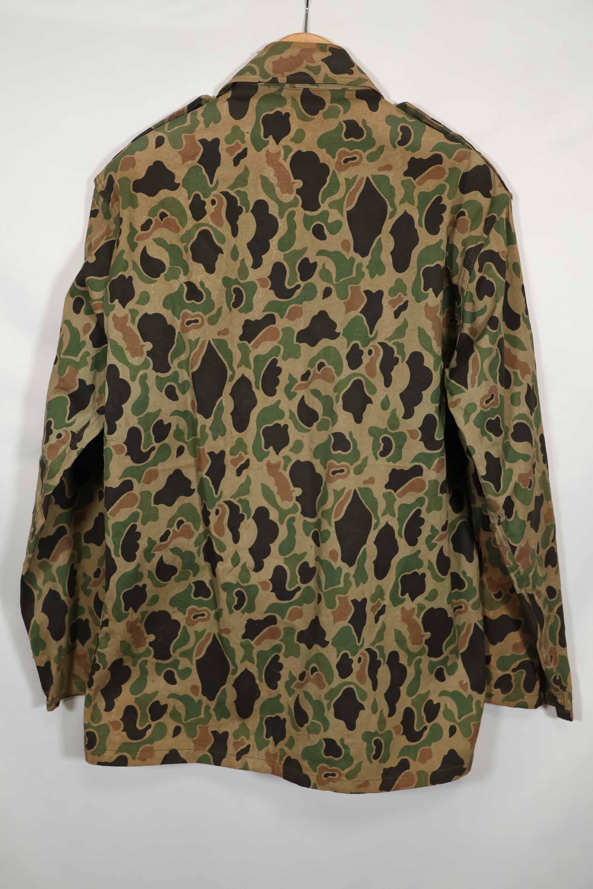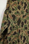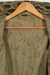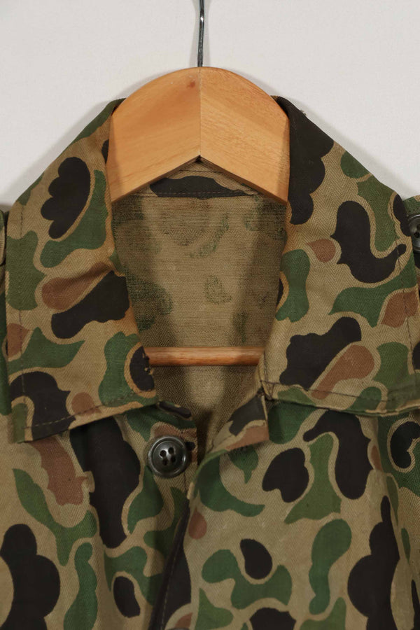 This is a used Korean military frogskin camouflage shirt from the 1980s, made of HBT fabric. It is in good condition with some wrinkles and stains from storage. The size is relatively large. There are marks where rank insignia was removed. Because it is a used item, it cannot be returned. Please understand.